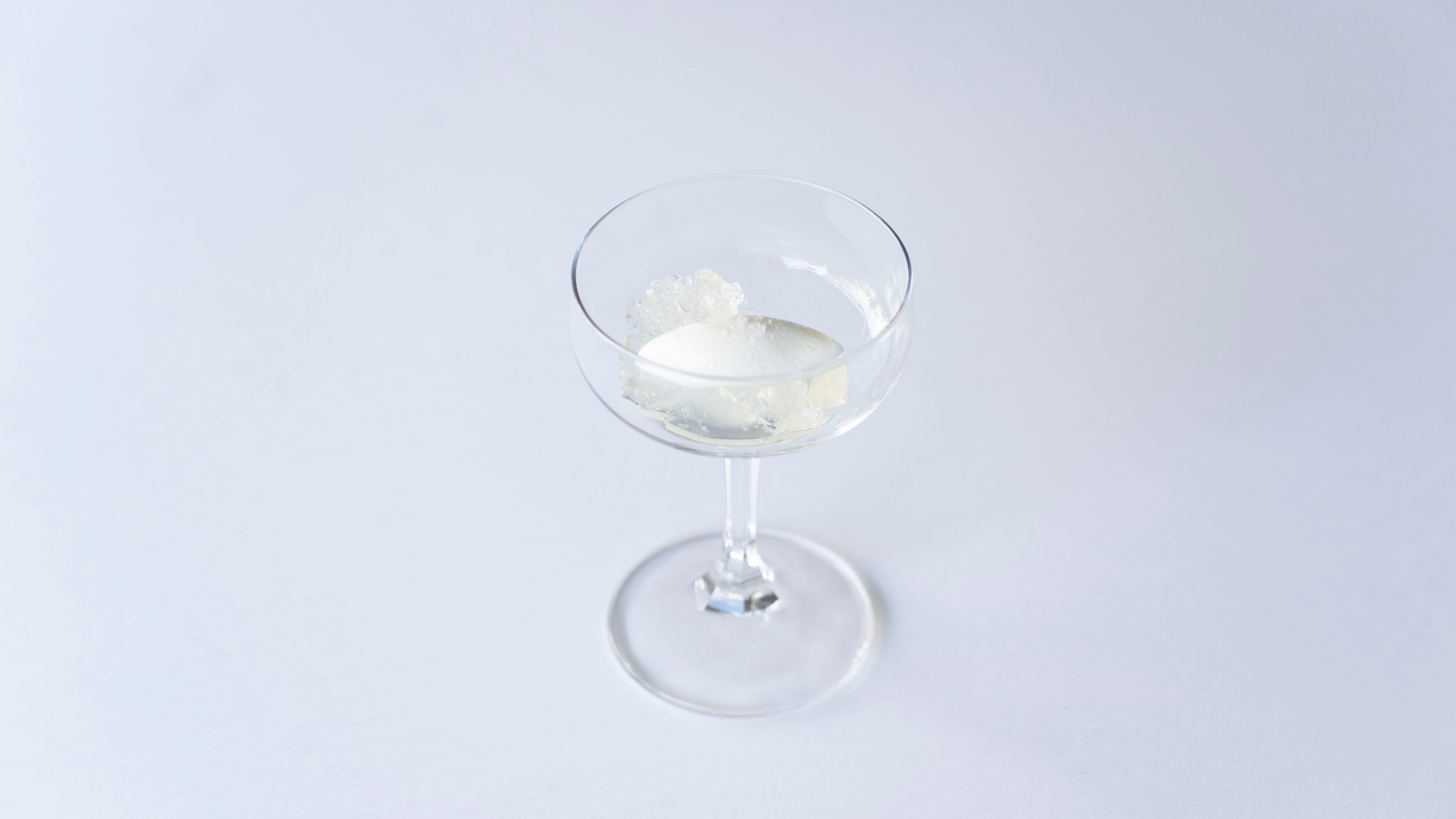 透明なトマトのジュレ / 白苺のグラニテ / ICONOオリーブオイルのジェラート / 珠洲の塩 / ホーリーバジルの蒸留水